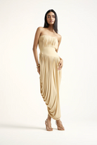 A striking gold dress crafted in malai, designed for effortless drape and soft body contouring. Its minimal silhouette highlights the richness of the colour and the fluid movement of the fabric, creating an understated yet radiant look. Paired with a sleek black leather corset belt, the waist is sculpted and defined, adding structure and contrast to the softness of the dress. Together, they create a refined balance of elegance and edge, perfect for special occasions that call for quiet impact.