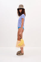 A soft striped cotton jersey t-shirt designed with a gently fitted silhouette and easy stretch. Finished with a trompe l’oeil bikini top appliqué for a bold, modern touch.