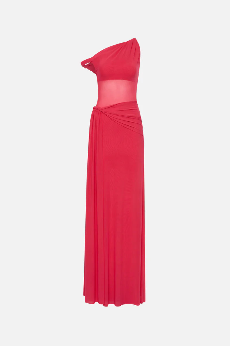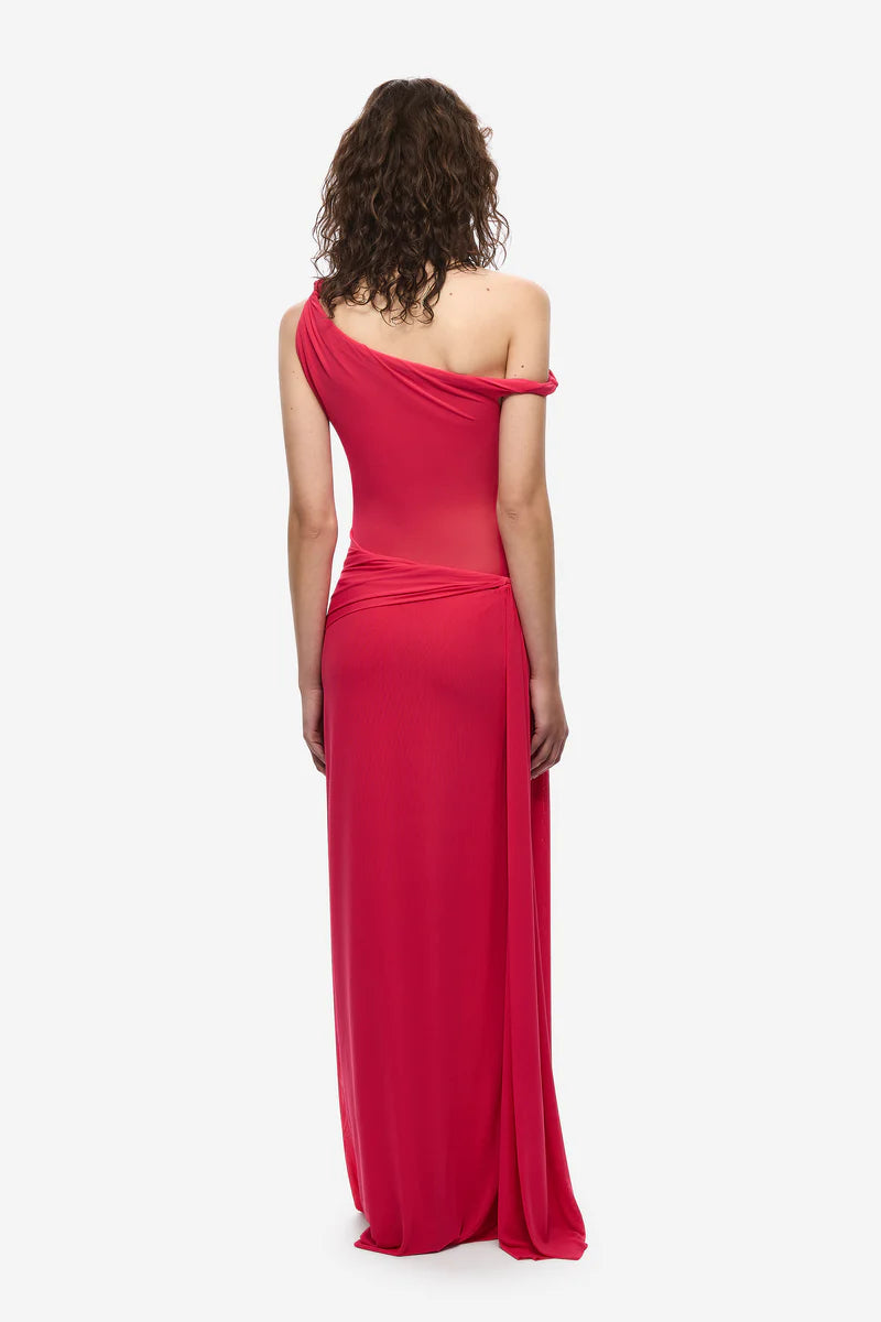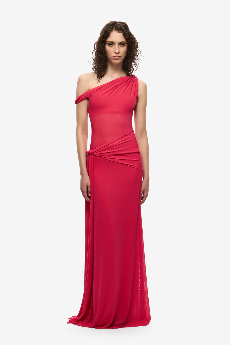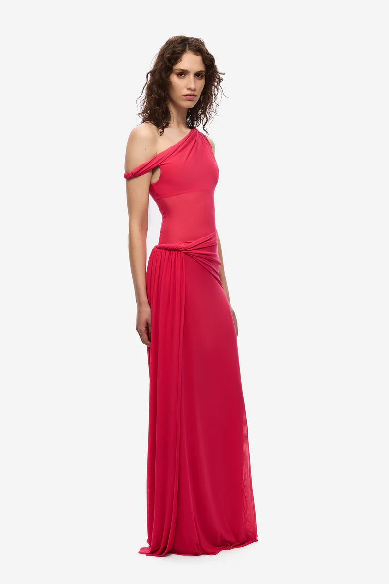 The Sisal Mesh Maxi Dress in Bright Rose, an effortless, yet sexy draped silhouette that skims the body.